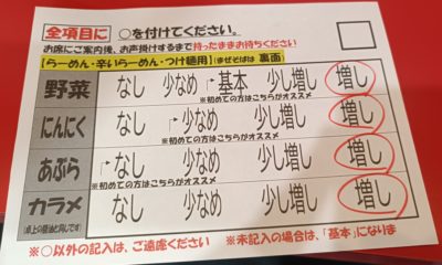 ・店内待ちの途中、壁際につり下がっている「無料トッピングシート」を1枚取り、置いてある赤ペンで希望の項目に赤丸を付けよう!