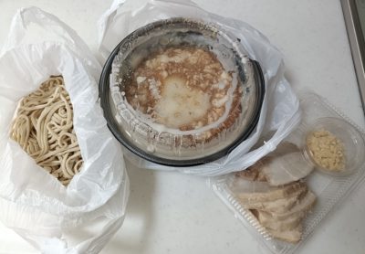 ↑中を見ると「スープ、茹で前の麺(2人前、約600g)、豚6枚(2人前で4枚+もう2枚)、ニンニク」が入っていた